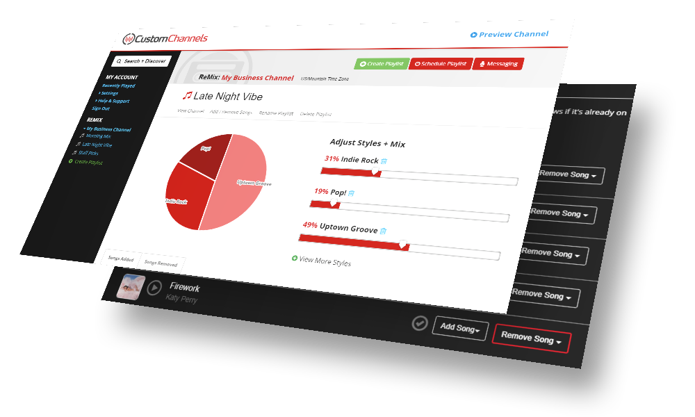 Custom Channels assigns an Account Manager and an expert Music Programmer to your account. They will work directly with your team to ensure that the music is exactly what you want. Custom Channels will interview your team and dive into your demographics, marketing, and brand to create the perfect playlist, soliciting feedback to ensure the music is what you want before launching. The channel remains a work in progress, changing and growing with your needs. Any issues, needs, or desires are facilitated directly through your account team at Custom Channels to ensure speedy resolution. They deliver "Linear" broadcast-style channels that play songs in a specific order created by our professional music curators.  All end users receive the same content at the same time.  This gives Custom Channels unrivaled ability to create perfect music mixes with the right balance of styles, eras, artists and more.