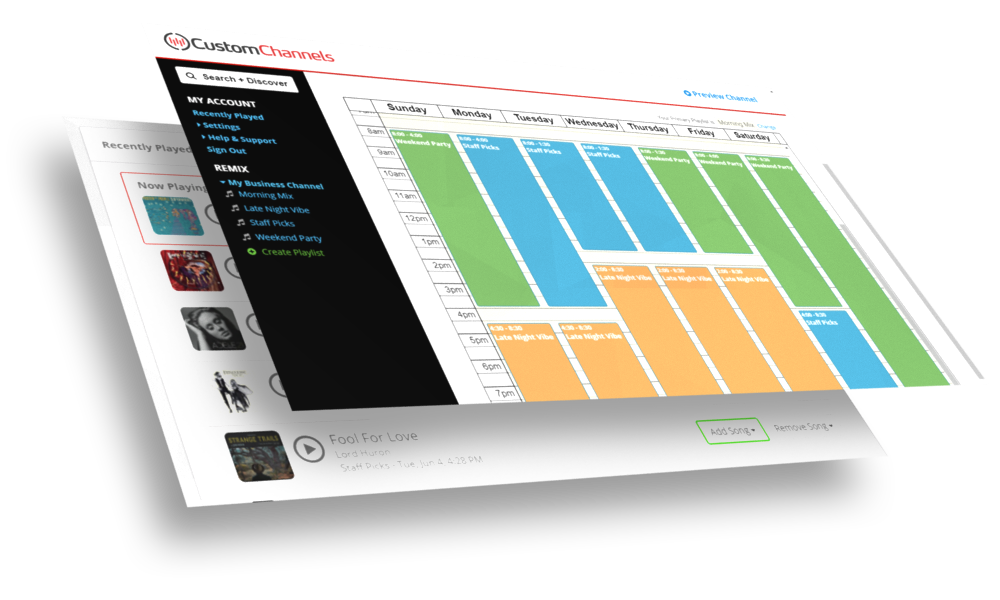 The channel is scheduled by your assigned programmer based on your needs, and any pre-recorded assets are managed by the Custom Channels production team. They can be scheduled at any interval and for any period of time that you desire. The music players are shipped with the client’s default on/off schedule, which can be changed at any time via the dashboard.